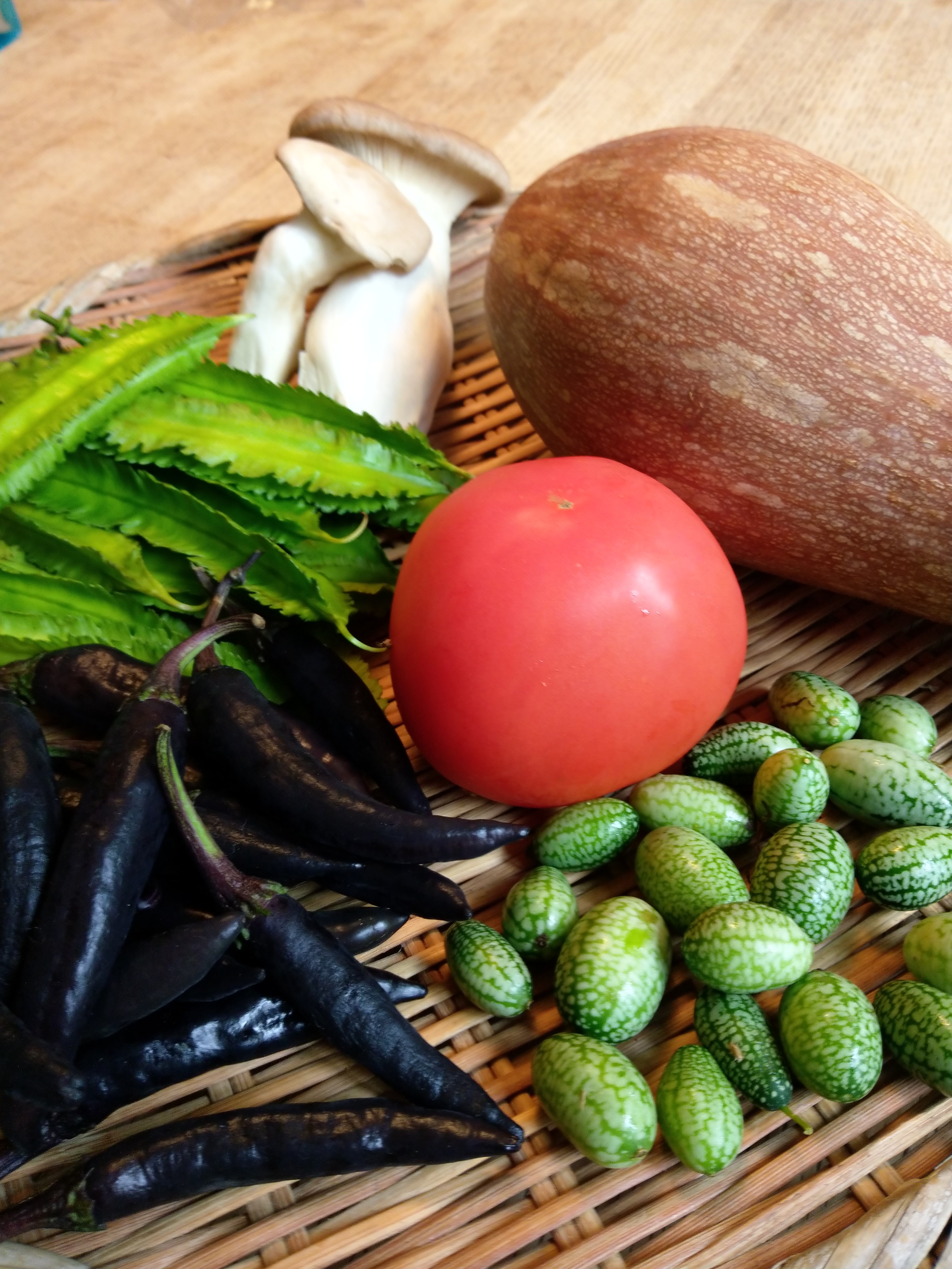 さて、戦利品がこちら。ひょうたんカボチャ、地元のエリンギ、何かおいしいらしいトマト、ポリフェノールたっぷりのむらさきのしし唐、かわいいメロンみたいなきゅうりなどなど。