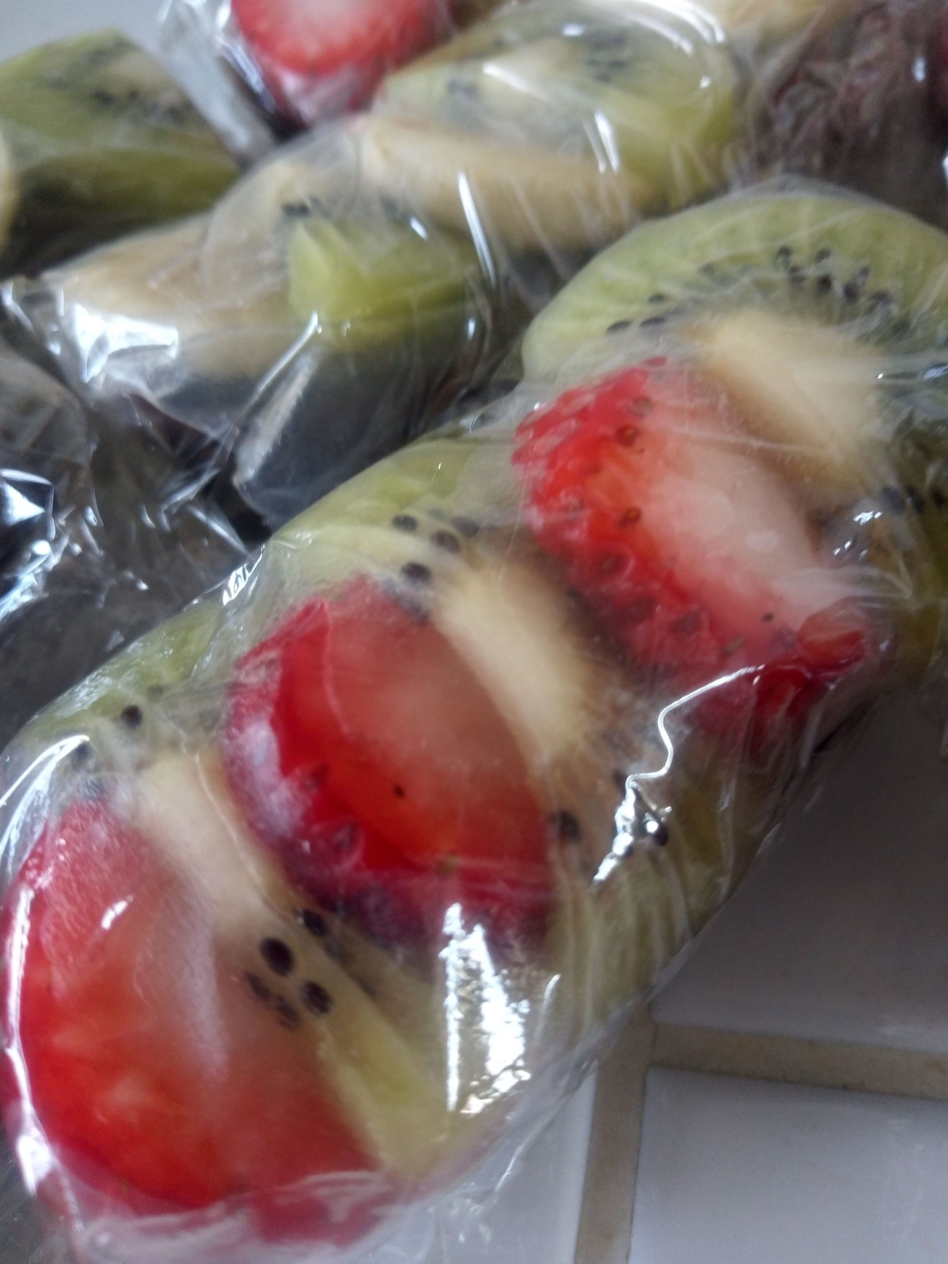 ⑦フルーツの面を上にして盛り付ける。すぐに乾いてしまうので、後から食べる時は一本づつラップに包む。