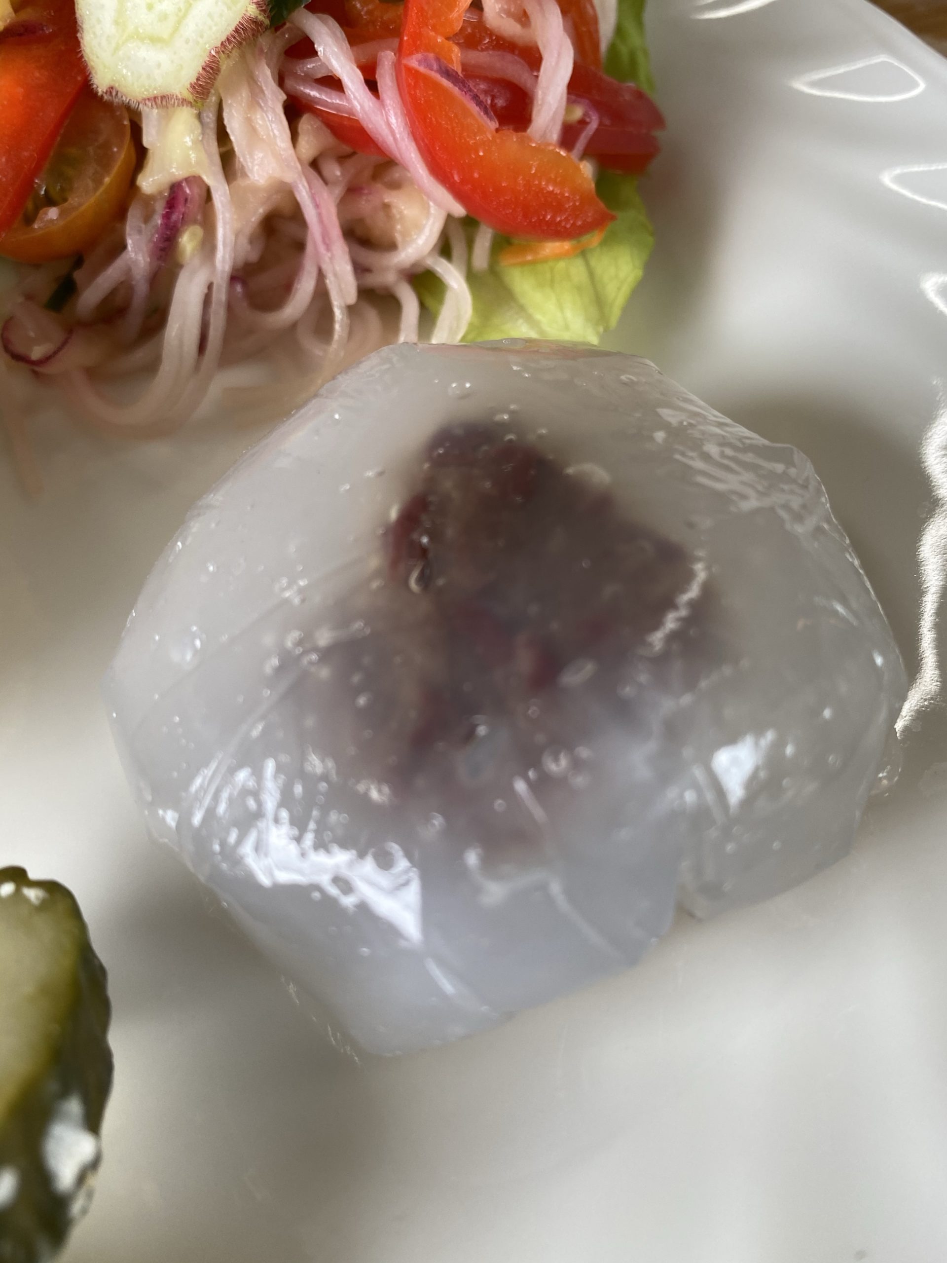 3.ラップを広げ⓶の1/4量をのせ、15gに丸めたあんこをのせ、ラップで茶巾に絞り、口をゴムで止め氷水に入れて5分くらい冷やす。