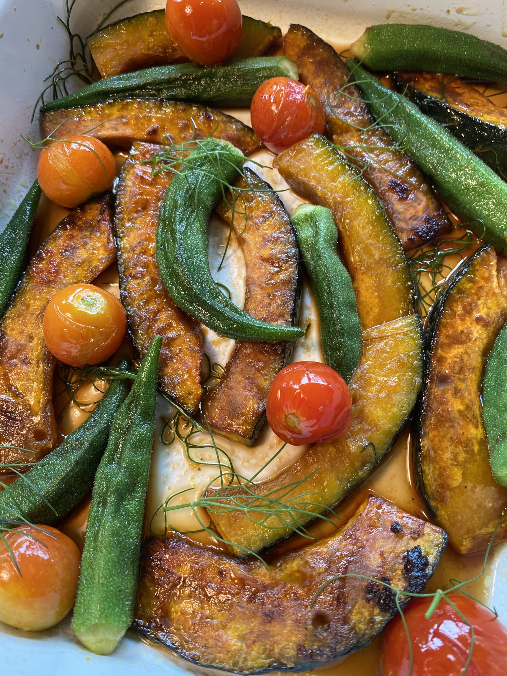 4.オクラとトマトにに焼き色がついたら、かぼちゃの入ったマリネ液に浸し、ハーブを散らして冷まして出来上がり。