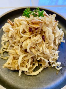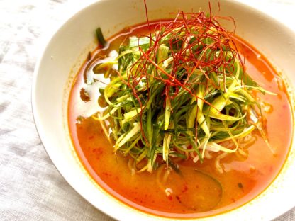 地元の有機農家さんに教えてもらったひすいナス。アクが少ないということなので、葛粉をまぶしてそうめん風にアレンジ。ひんやりしながらも体の内部を暖めてくれる葛を絡めました。色がきれいなので目にも楽しいメニューです。