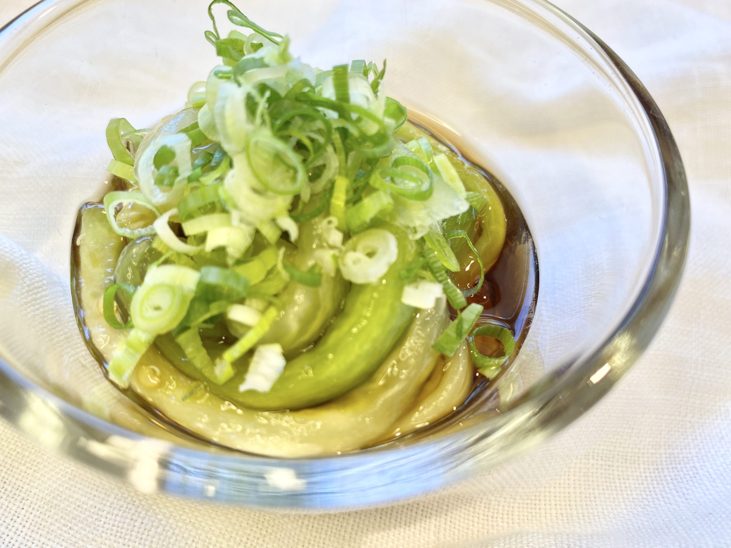 ふわふわ、とろりとしたナスの食感や旨味を葛の中に閉じ込めたような料理です。ひんやりしてのどにつるっと入っていくので、夏の疲れで食欲のなくなってきた今の時期にピッタリ。