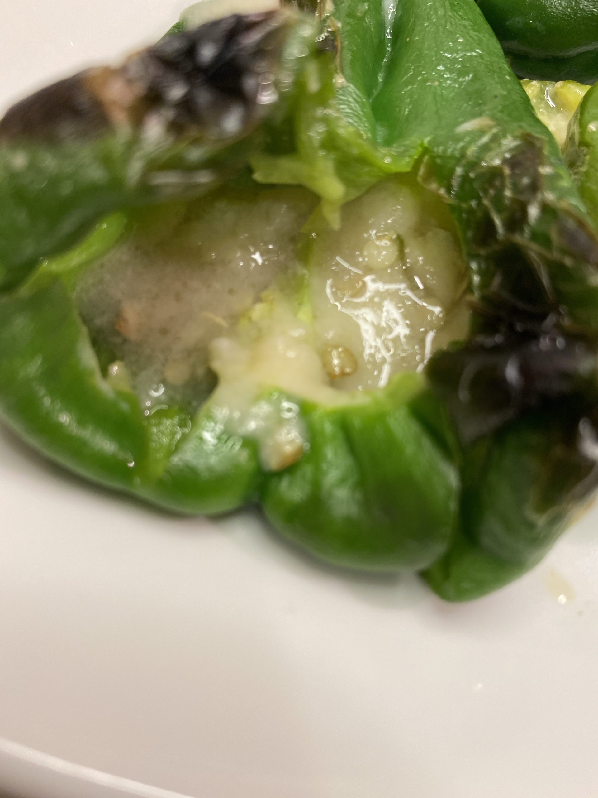 しんなりと焼けたピーマンは甘味が引き出され、中からトロリとでてくる酒粕チーズと合わせるとめちゃめちゃおいしい。ピーマンの青臭さもチーズとよく合います。こんなにおいしいのに、詰めて焼くだけの簡単さって…、最高です!(^^)!