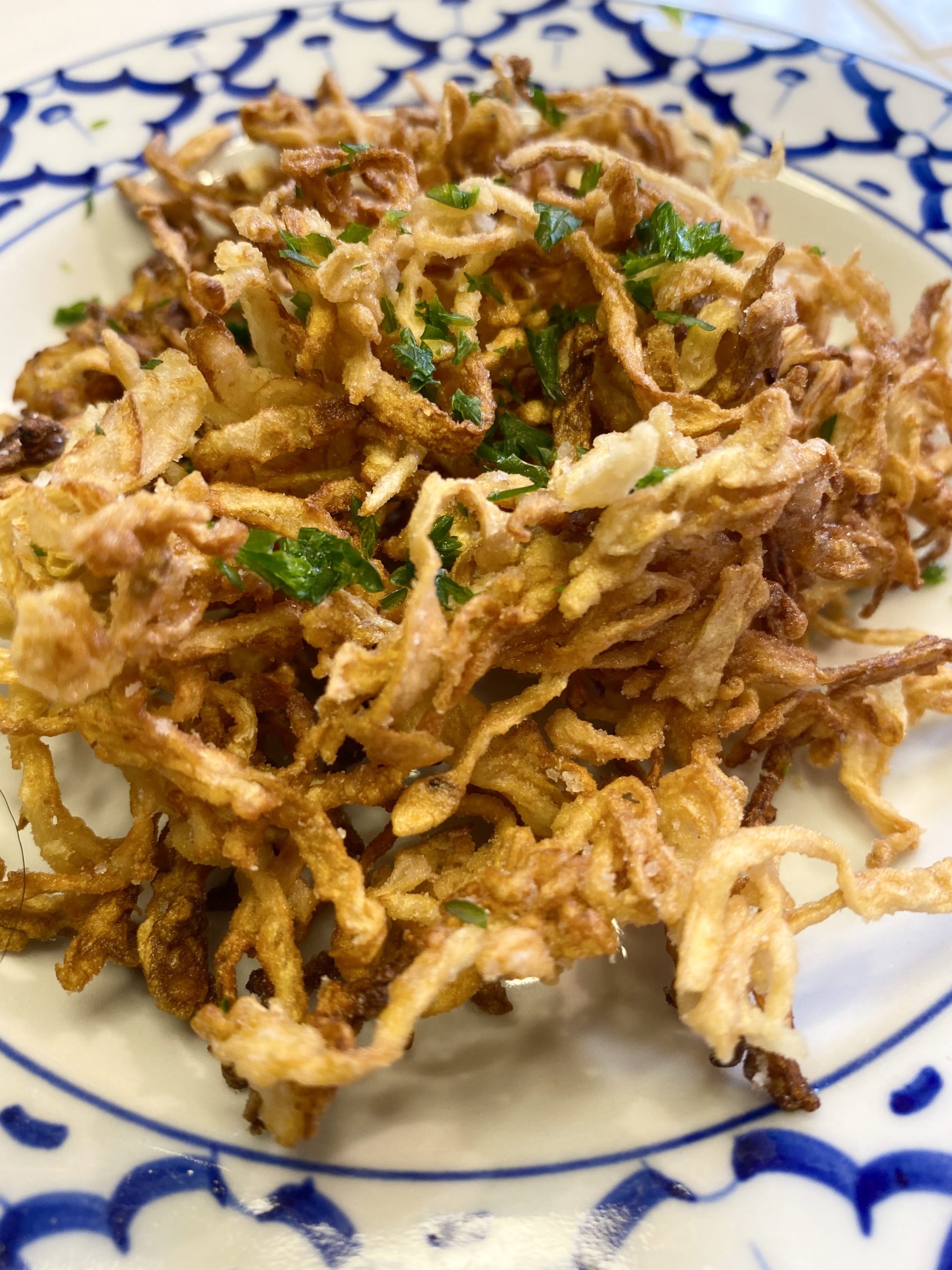 3.170度の油できつね色になるまで揚げ、塩、乾燥パセリをまぶして出来上がり。