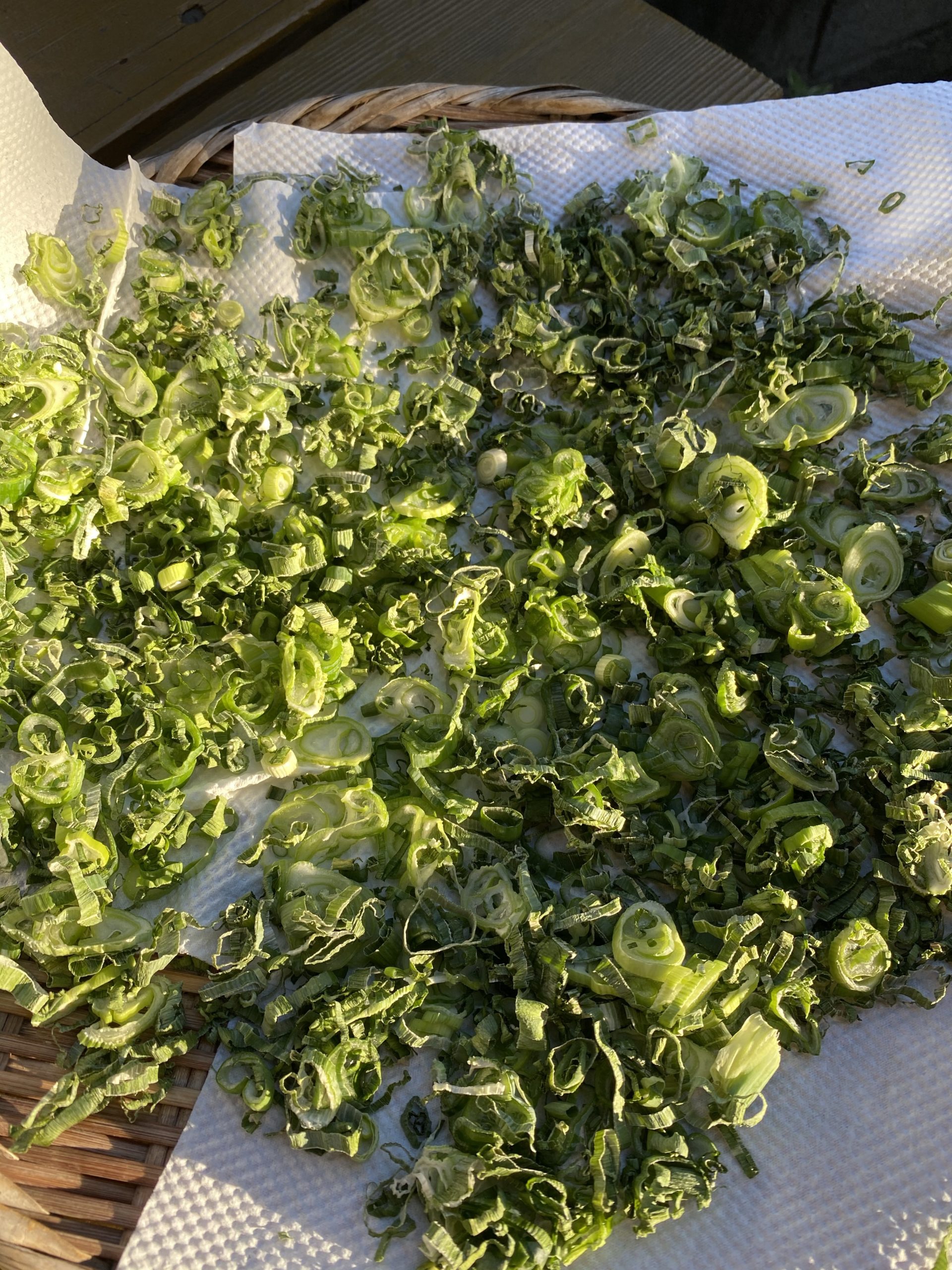 ねぎを小口切りにします。刻んで200g計量したら、ざるに広げて太陽の下で5~6時間干してみました。これでだいたい半分のかさに減りました。