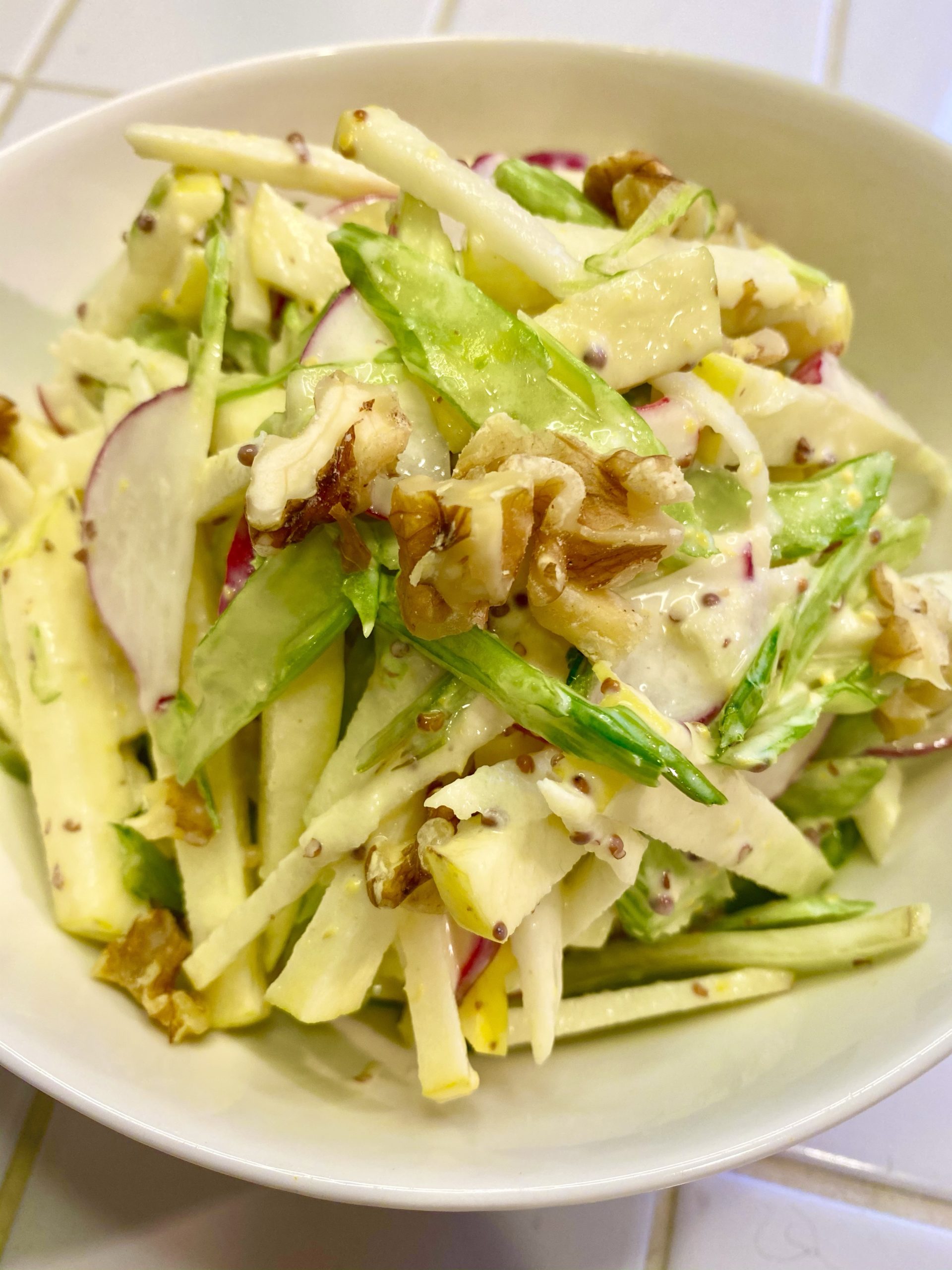 2.1にマヨネーズとマスタードを入れ、塩胡椒で味を整え、食べやすく切ったクルミを散らしてできあがり。
