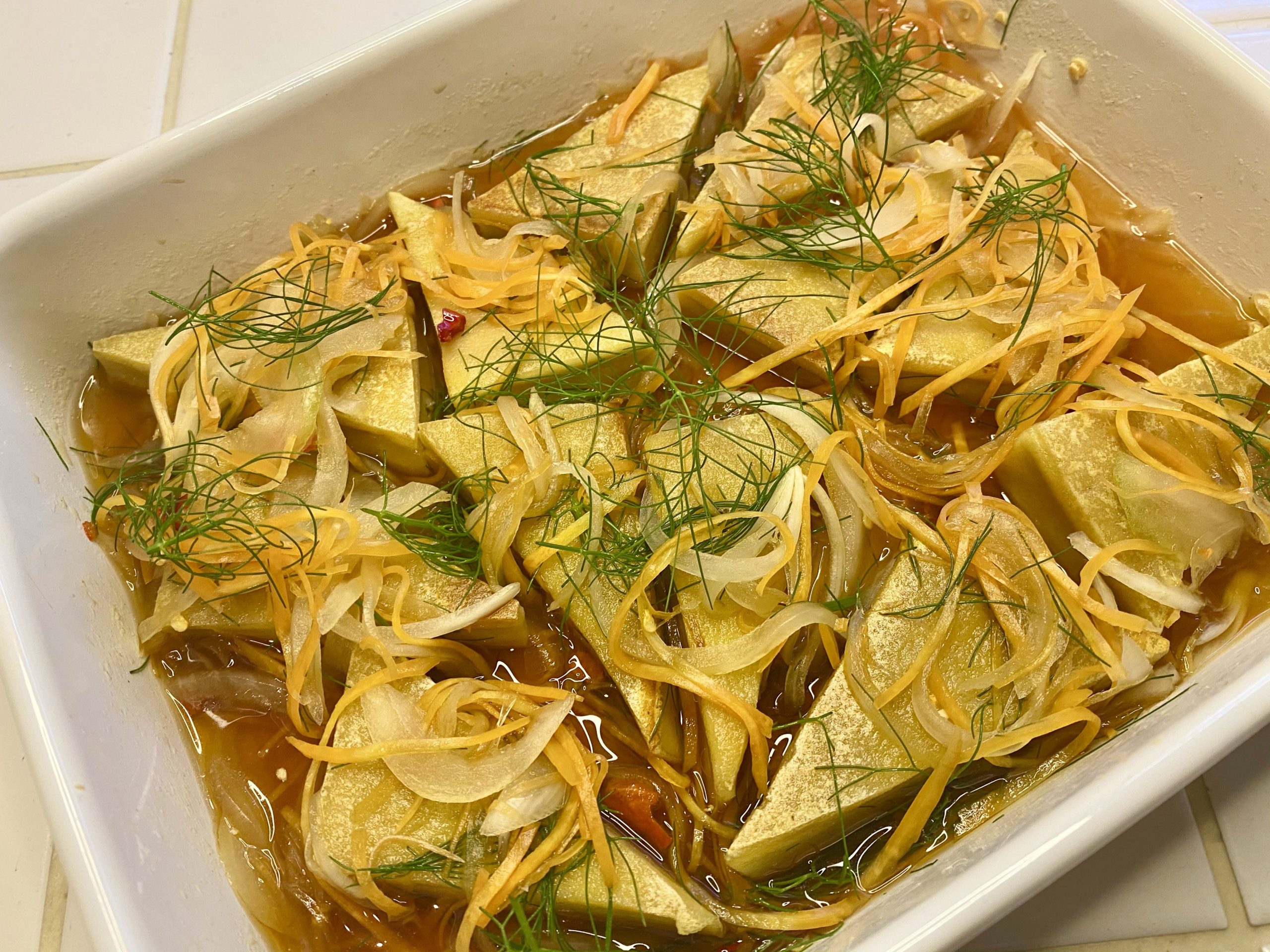 そんな栄養価の高い高野豆腐ですが、料理するとなるとつい煮物一辺倒になりがち…。そこで今回は高野豆腐で作る南蛮漬けを紹介します。小鯵や鶏肉などで作ることが多い南蛮漬けですが、鯵や鶏と同等のたんぱく質をもつ高野豆腐なら、栄養的にもそん色はありません。