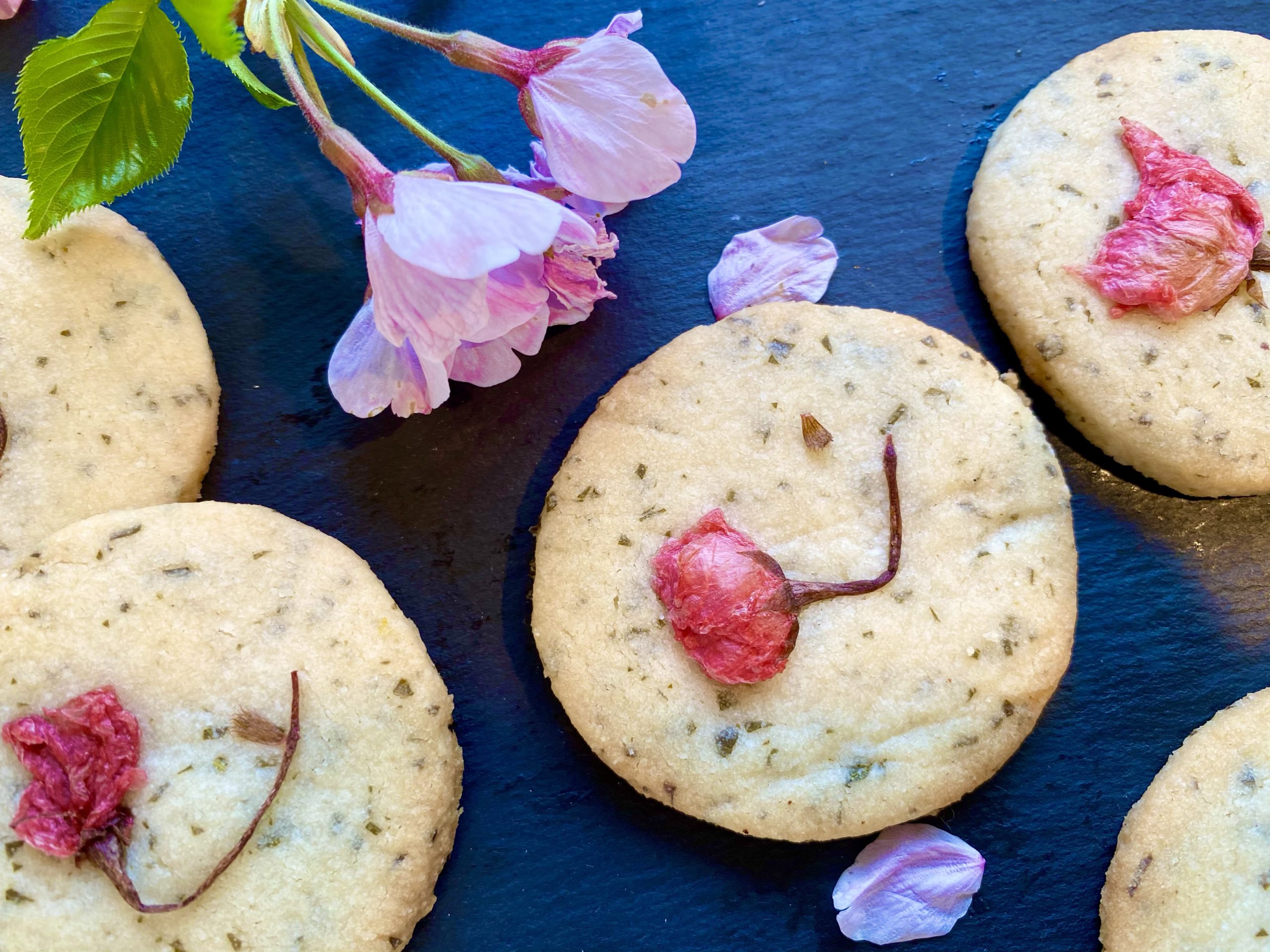 4.2に3を入れてよく混ぜてまとめ冷蔵庫で30分寝かせてから、3mm厚さに伸ばして型で抜き、上に1の桜の花をのせて180度のオーブンで10〜15分焼く