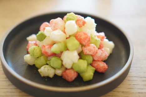 ⒉粗熱が取れたら求肥を半分に折りたたみカードで6等分する。求肥を中心に寄せてつまみ丸くする。