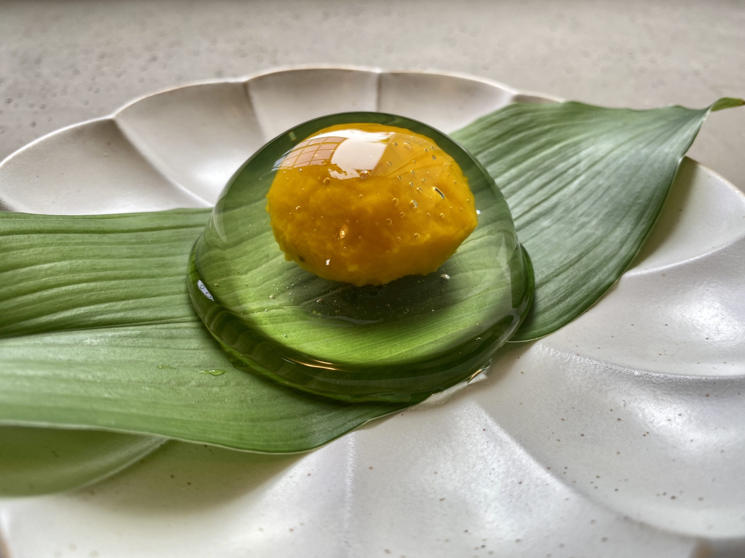 中に入れるのは蒸し煮で甘みを引き出したカボチャのあんこ。カボチャの黄色い色がとっても綺麗な水まんじゅうです。