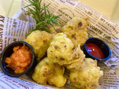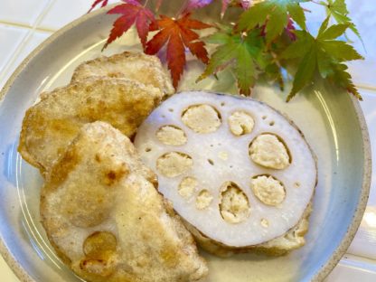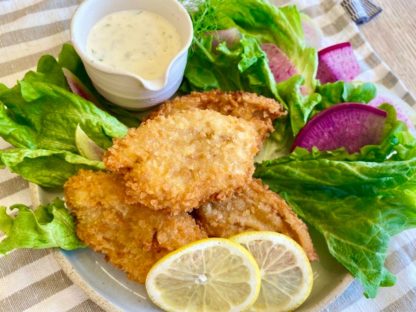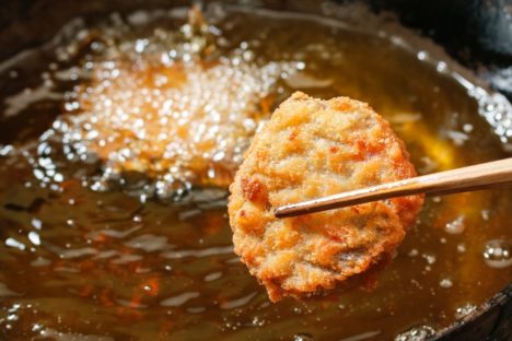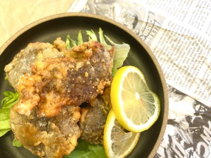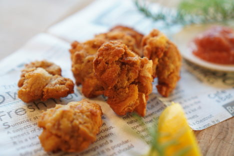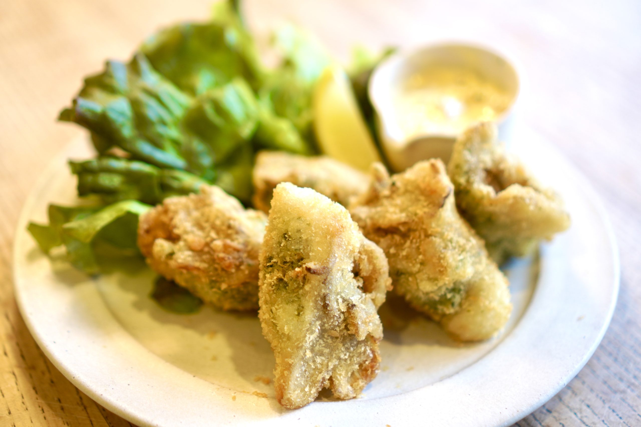 5.中温の油できつね色になるまで揚げる。お好みで豆乳マヨネーズに刻んだラッキョウをまぜてタルタルソースを作り、添える。