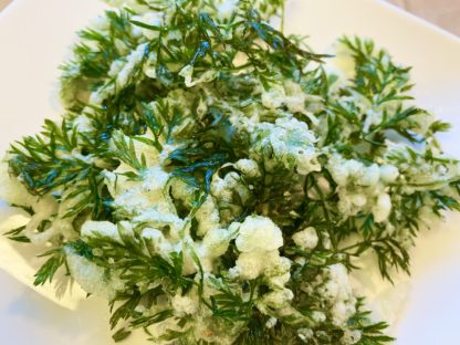 3.マイタケを大きめにほぐし、2を1片にのせてカキのように形作り、米粉をまぶしておく(分量外)