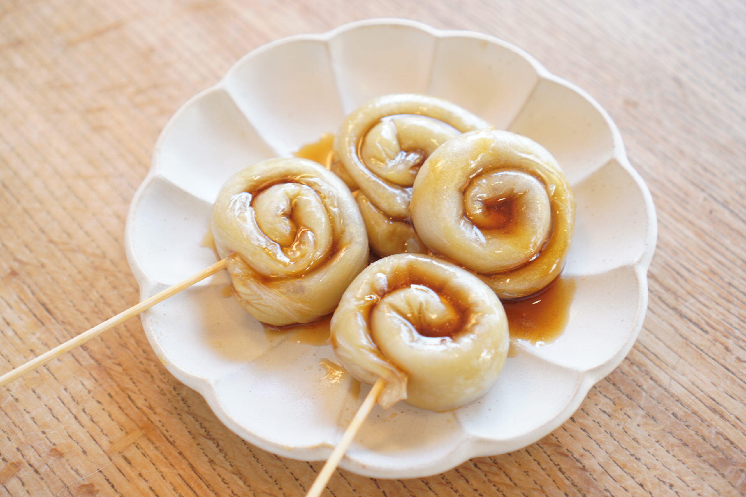 ⒋3をぐるぐる巻きにして巻き終わりを竹串で刺す。