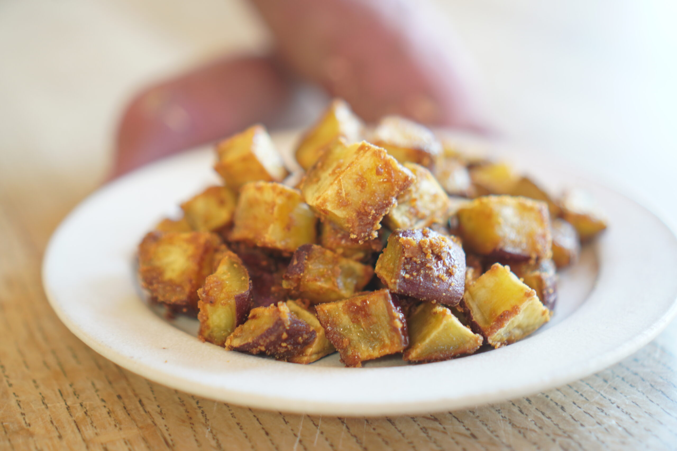 ⒈さつまいもは1cm角の賽の目に切り、塩をまぶして小鍋に入れ、水を注ぎ、柔らかくなるまで蒸し煮する。