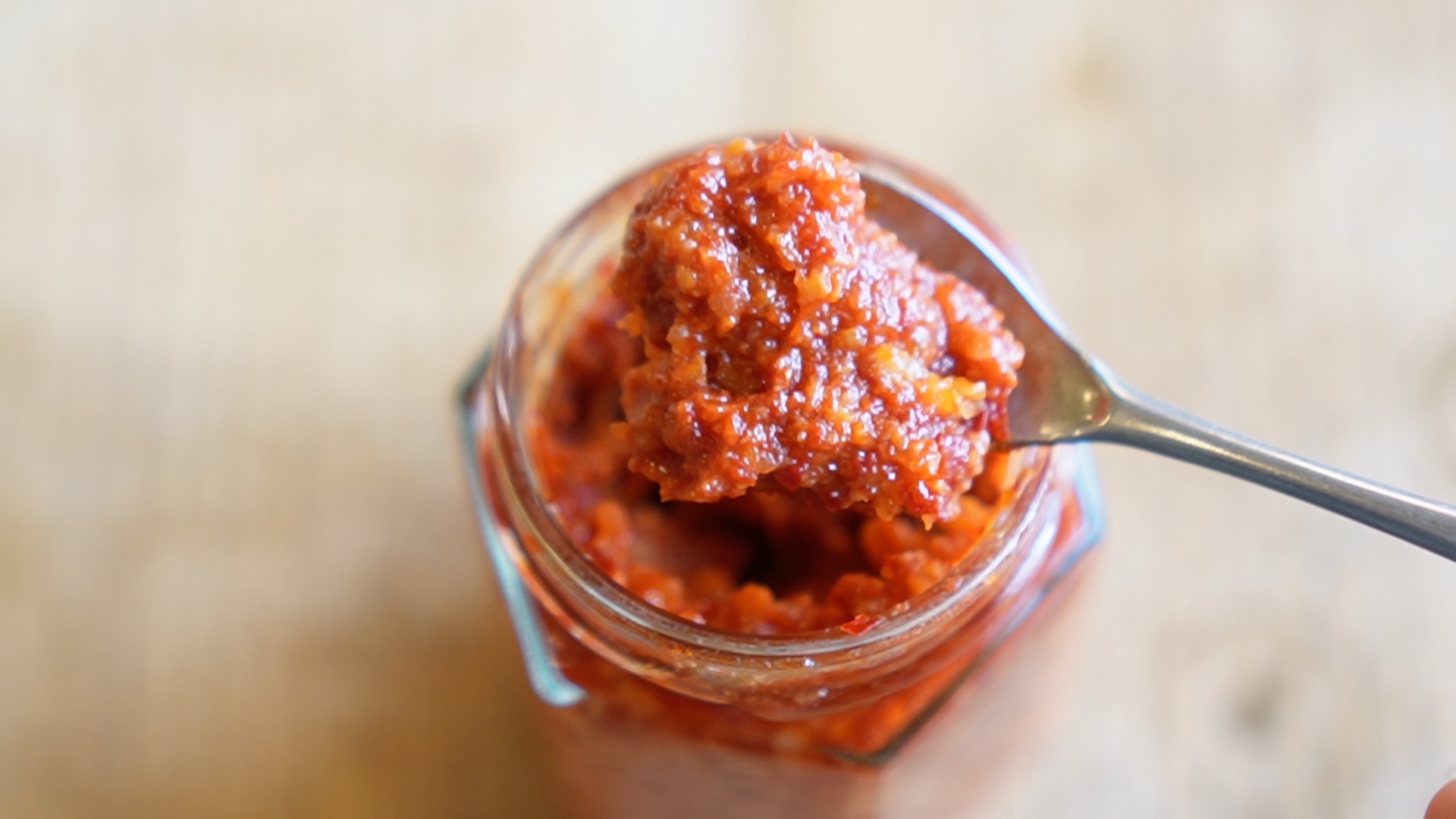 ⒈清潔な瓶に麹と塩と唐辛子を入れてよくまぜる。
