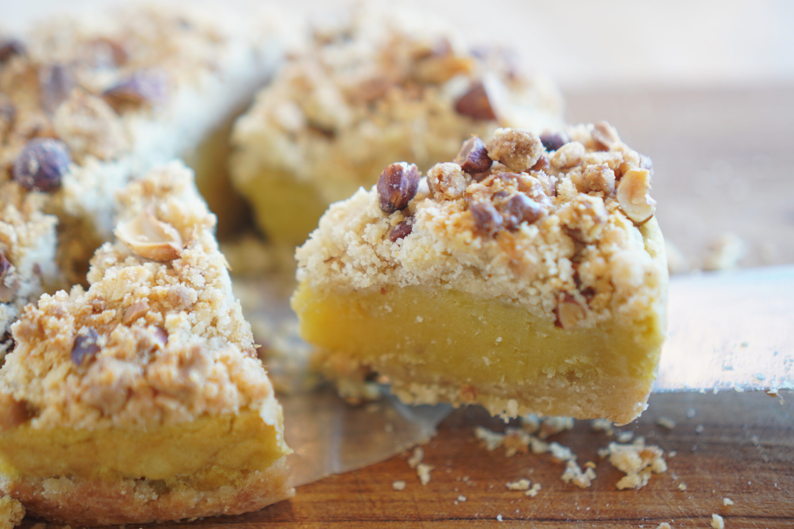 ⒋型にオーブンシートを敷いて生地の2/3を押しながら詰め、その上にさつまいもペースト、残りのクランブル生地と砕いたナッツを混ぜたものを乗せて、軽く押さえる。