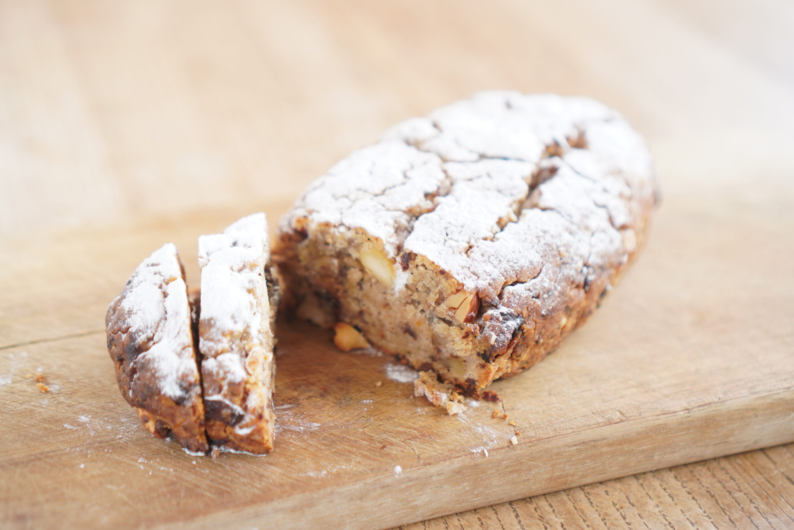⒉1に米粉、アーモンドパウダー、ベーキングパウダーを加えてよく混ぜ、レーズン、刻んだレモンピールとナッツ類を加えてよく混ぜる。