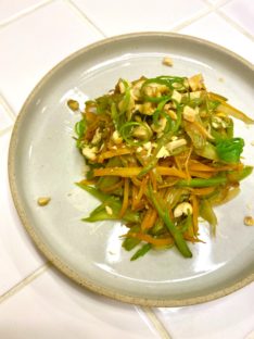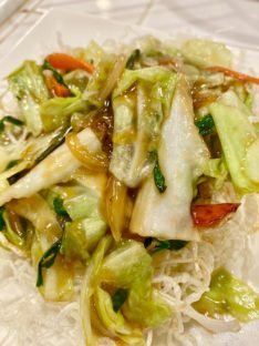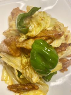 4長ネギのみじん切りも入れて炒め、ネギがしんなりしてきたら弱火にして蓋2〜3分火を通し、最後にチリソースを絡めて出来上がり。