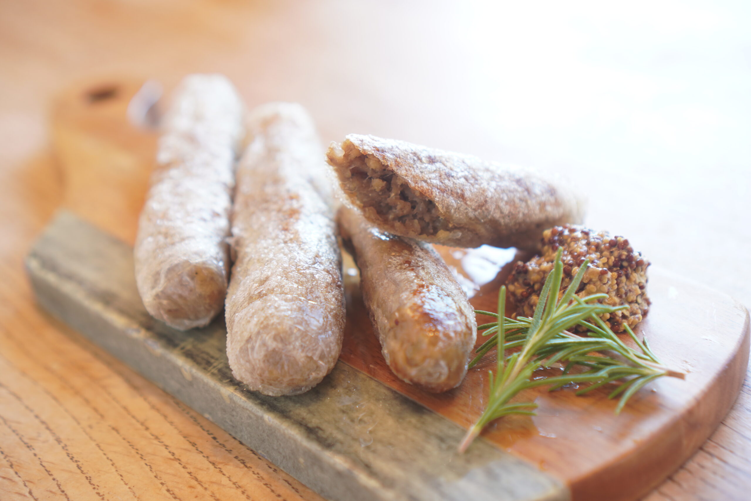 ⒌フライパンに油(分量外)を熱し、4を入れてきつね色に焼いたら、弱火にして3分ほど蒸し焼きにする。(太さによる)マスタードを添えて出来上がり。