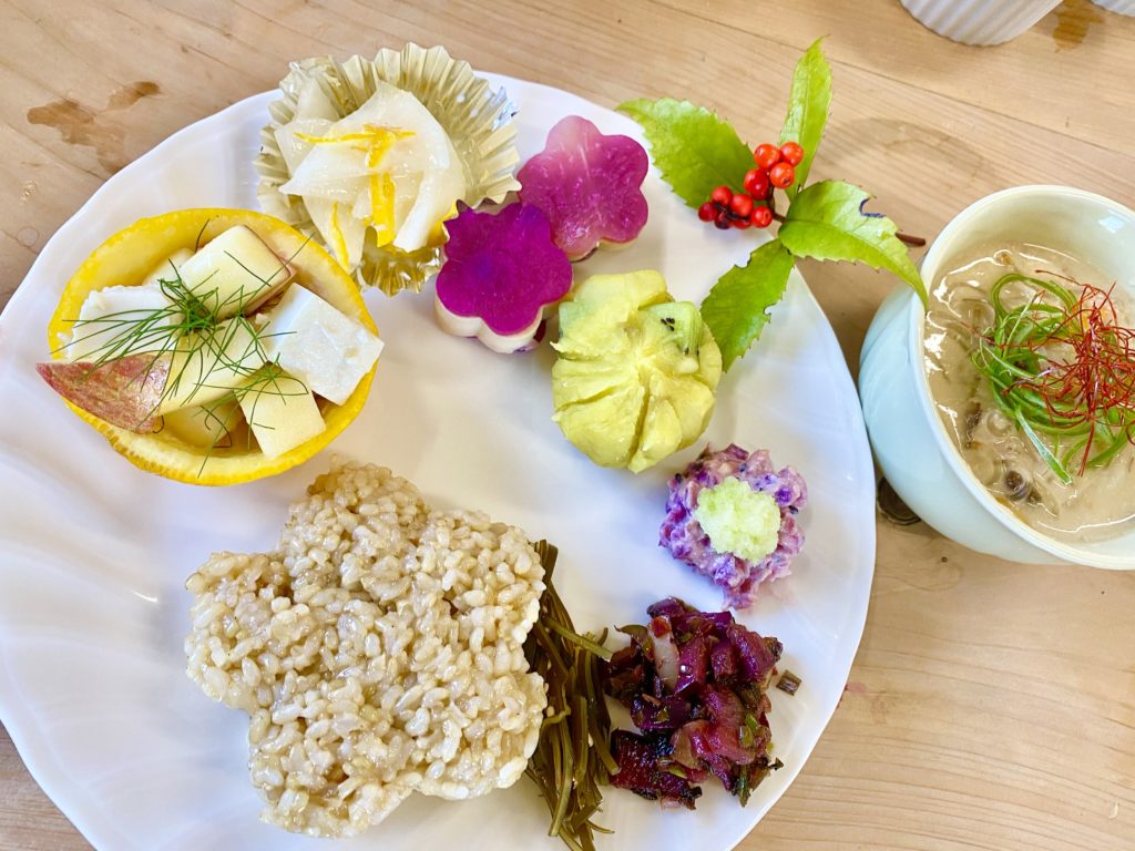梅醤番茶/大根湯/生姜昆布/里芋パスタ/腰湯/雑穀ごはん/南瓜コロッケ/玄米おかゆパン/干しあんずのタルト/大根もち…etc