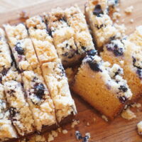 ⒊クランブル生地を作る。ボウルにブルーベリー以外の材料を入れて、油の粒がなくなるまで手ですり混ぜ、ブルーベリーを加えてざっと混ぜる。
